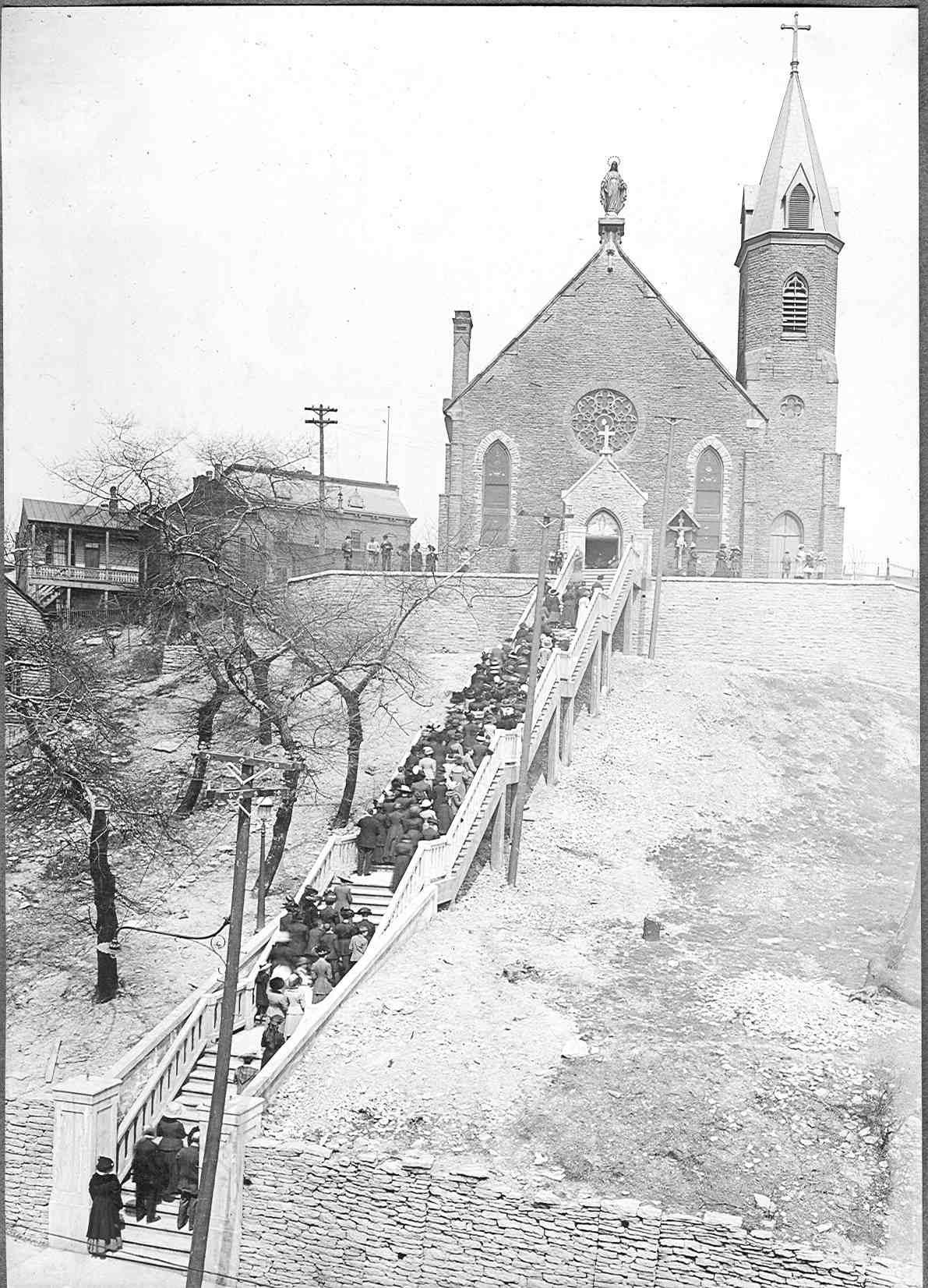Sometime soon after November 1848, John Lowden, built this home at the corner of today’s Hill and St. Gregory Streets. Lowden was a prominent stonemason and builder and is believed to have been involved in operating the stone quarries on Mount Adams coursing down the Hill from Louden Street, thought to be named for Lowden even though the spelling is different. The home has been occupied since 1977 by Mary Baskett and is believed by many to be the oldest home on Mount Adams. Immaculata Church is seen in the background.